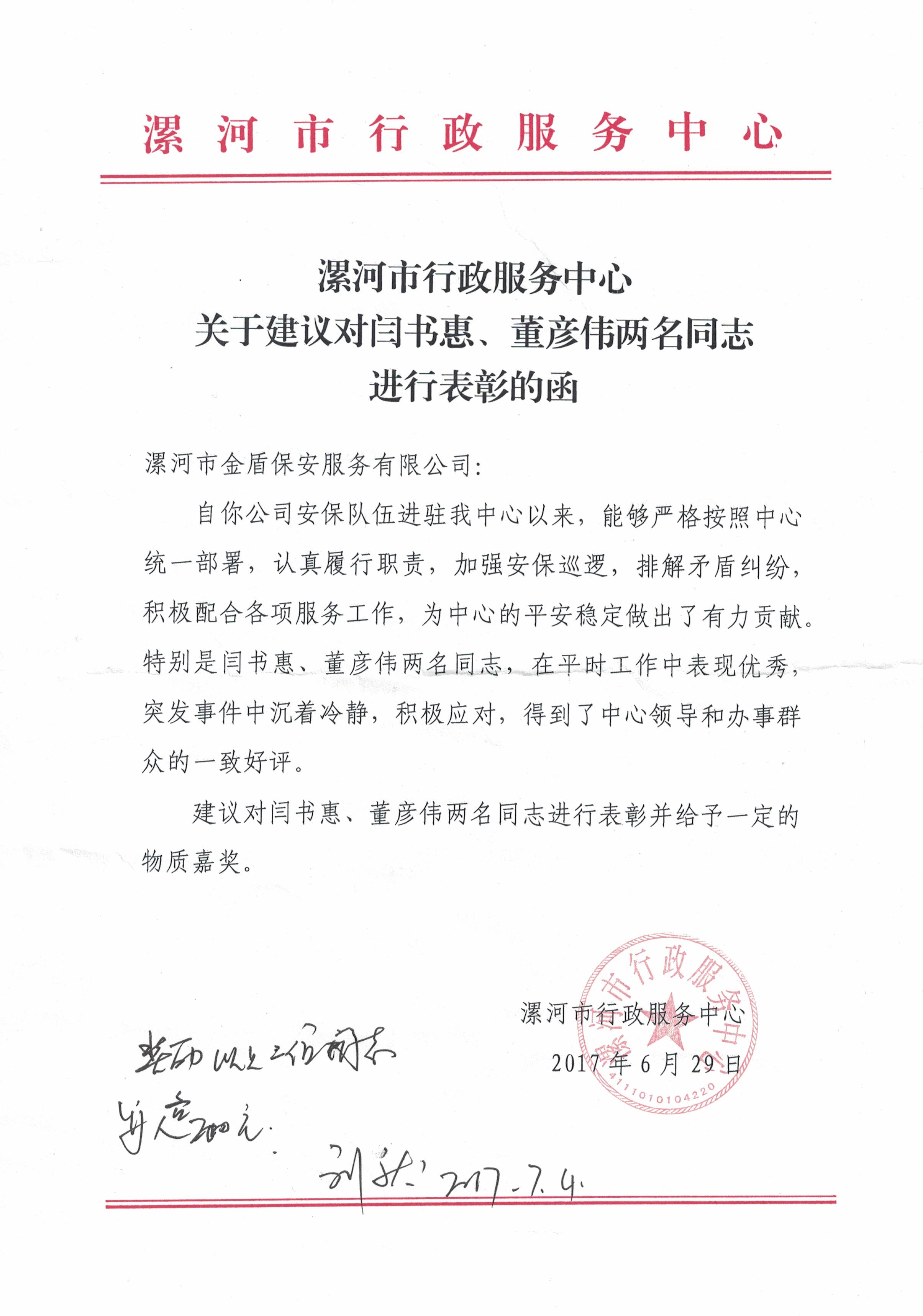 漯河市行政服務(wù)中心對(duì)金盾保安公司員工的的表彰函