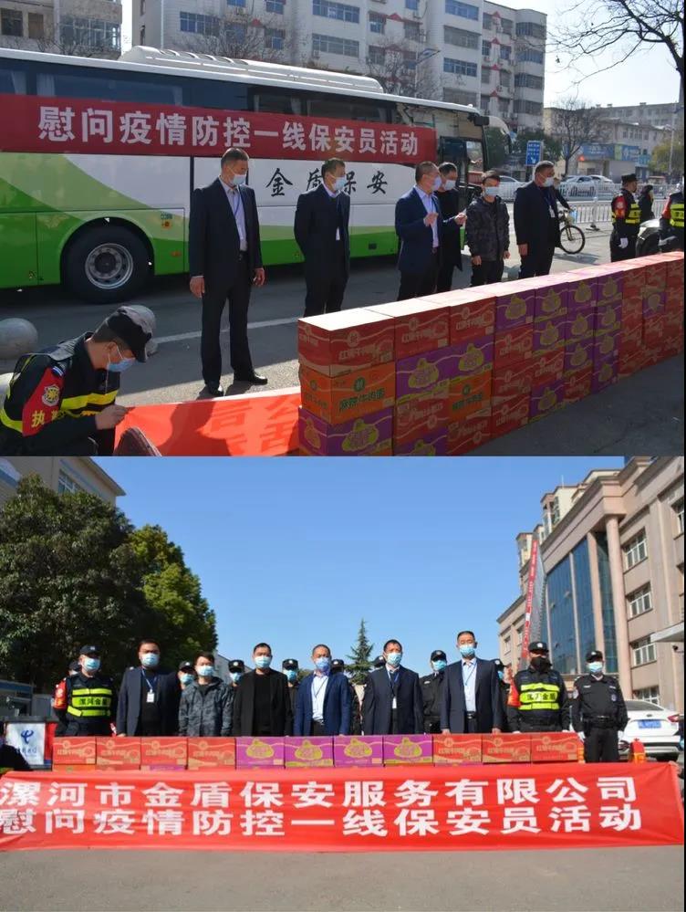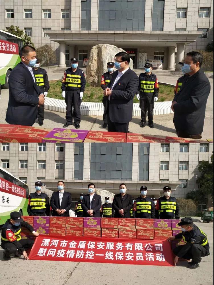 ▼漯河職業(yè)技術(shù)學(xué)院保衛(wèi)處處長(zhǎng)王洪克,科長(zhǎng)牛春雨與公司領(lǐng)導(dǎo)班子共同慰問堅(jiān)守在疫情防控一線的保安員代表。